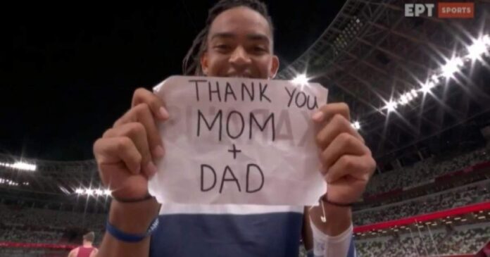 Μόλις ολοκλήρωσε την τρίτη προσπάθεια στα 4.87 μέτρα, έβγαλε το χαρτάκι που είχε το όνομα του και από πίσω είχε ένα όμορφο μήνυμα για τους γονείς του, τους οποίους ευχαρίστησε σε μια υπέροχη κίνηση.