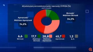 Θετικά και μάλλον θετικά αξιολογεί την κυβέρνηση το 45,7% των πολιτών, ενώ οι αντίστοιχες αξιολογήσεις για την αξιωματική αντιπολίτευση φτάνουν στο 24,3%. Αρνητικά ή μάλλον αρνητικά αξιολογεί την αντιπολιτευτική τακτική του ΣΥΡΙΖΑ το 74,5%.