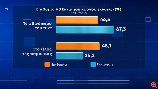 Μοιρασμένοι είναι οι ψηφοφόροι σχετικά με τον χρόνο των εκλογών, με τους μισούς να προτιμούν το το φθινόπωρο και τους υπολοίπους το τέλος της τετραετίας. Ωστόσο, δύο στους τρεις εκτιμούν ότι οι εκλογές θα γίνουν το φθινόπωρο. Συγκεκριμένα, για το πότε θέλουν οι πολίτες εκλογές, το 46,5% θέλει το φθινόπωρο, το 48,1% στο τέλος της τετραετίας. Παράλληλα, το 67,3% πιστεύει ότι οι εκλογές θα γίνουν το φθινόπωρο, ενώ το 26,2% πιστεύει ότι θα γίνουν στο τέλος της τετραετίας.