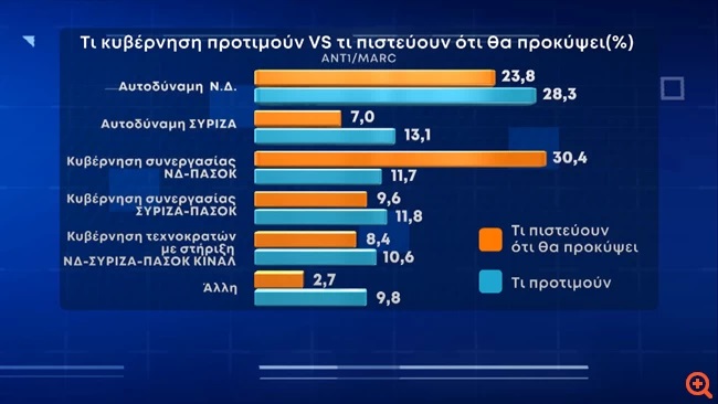 Σχεδόν ένας στους τρεις επιθυμεί να προκύψει από τις κάλπες αυτοδύναμη κυβέρνηση της Νέας Δημοκρατίας, αλλά ένας στους πέντε πιστεύει ότι αυτό είναι εφικτό. Αντίθετα, ένας στους τρεις πιστεύει ότι θα προκύψει κυβέρνηση συνεργασίας ΝΔ -ΠΑΣΟΚ, παρόλο που μόνον ένας στους δέκα θα επιθυμούσε να συμβεί κάτι τέτοιο. Μόλις ένα 13% θέλει αυτοδύναμη κυβέρνηση ΣΥΡΙΖΑ και μόνον το 7% πιστεύει ότι κάτι τέτοιο θα προκύψει τελικά από την κάλπη.