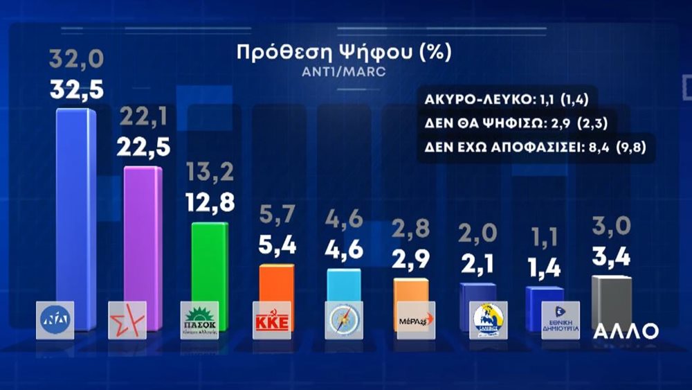 Συγκεκριμένα, στην πρόθεση ψήφου η ΝΔ συγκεντρώνει ποσοστό 32,5%, ο ΣΥΡΙΖΑ 22,5 %, ενώ ακολουθούν το ΠΑΣΟΚ με 12,8%, το ΚΚΕ 5,4%, η Ελληνική Λύση 4,6% και το ΜέΡΑ25 με 2,9%.