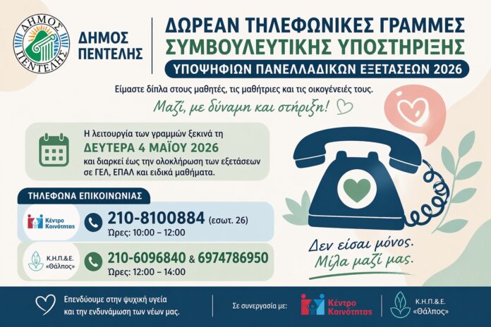Ο Δήμος Πεντέλης, στο πλαίσιο των δράσεων στήριξης της μαθητικής κοινότητας και των οικογενειών της, ανακοινώνει για δεύτερη συνεχή χρονιά τη λειτουργία δωρεάν τηλεφωνικών γραμμών ψυχολογικής υποστήριξης για την περίοδο των Πανελλαδικών Εξετάσεων 2026, σε συνεργασία με το Κέντρο Κοινότητας και το Κέντρο Ημέρας Παιδιών & Εφήβων Μελισσίων «Θάλπος».