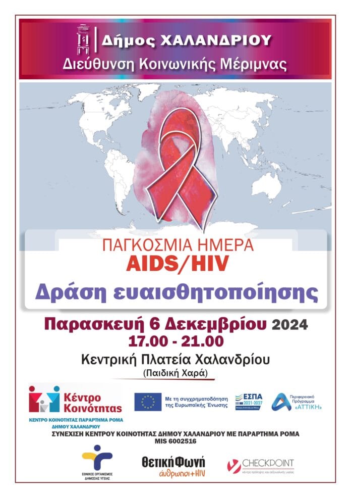 Εκδήλωση ενημέρωσης και πρόληψης, στο πλαίσιο της Παγκόσμιας Ημέρας AIDS/HIV(1η Δεκεμβρίου), διοργανώνουν την Τρίτη 6 Δεκεμβρίου, το Τμήμα Κοινωνικής Μέριμνας, Εποπτείας Εθελοντισμού & Πολιτικών Ισότητας των δύο φύλων και το Κέντρο Κοινότητας του Δήμου Χαλανδρίου- παράρτημα ΡΟΜΑ, σε συνεργασία με τον Εθνικό Οργανισμό Δημόσιας Υγείας (ΕΟΔΥ) και τον Σύλλογο Οροθετικών Ελλάδας- Θετική Φωνή.