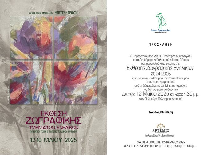 Ο Δήμαρχος Αμαρουσίου Θεόδωρος Αμπατζόγλου και ο Αντιδήμαρχος Πολιτισμού Νικόλαος Πέππας σας προσκαλούν στα εγκαίνια της Έκθεσης Ζωγραφικής Ενηλίκων των Τμημάτων του Κέντρου Τέχνης και Πολιτισμού, στον Πολυχώρο Πολιτισμού «ΑΡΤΕΜΙΣ» (Βασ.Όλγας 14 & Σουρή), τη Δευτέρα 12 Μαΐου 2025 και ώρα 7:30 μ.μ.