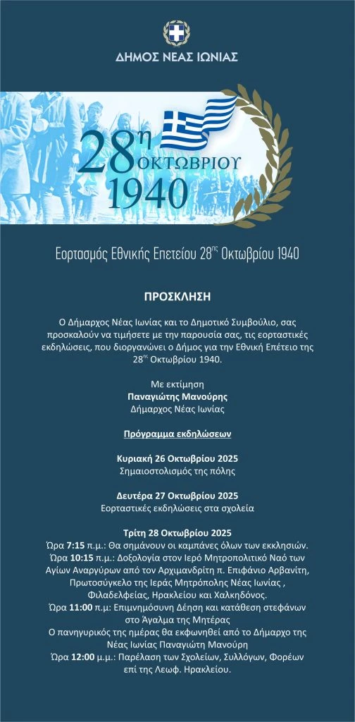 Ο Δήμαρχος Νέας Ιωνίας και το Δημοτικό Συμβούλιο, σας προσκαλούν να τιμήσετε με την παρουσία σας, τις εορταστικές εκδηλώσεις, που διοργανώνει ο Δήμος για την Εθνική Επέτειο της 28ης Οκτωβρίου 1940.