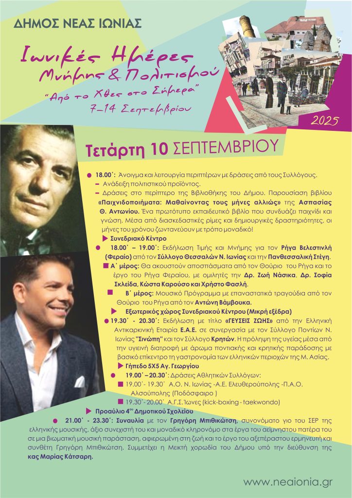 - 30΄ – 20.30΄: Εκδήλωση με τίτλο «ΓΕΥΣΕΙΣ ΖΩΗΣ» από την Ελληνική Αντικαρκινική Εταιρία Ε.Α.Ε. σε συνεργασία με τον Σύλλογο Ποντίων Ν. Ιωνίας ‘’Σινώπη’’ και τον Σύλλογο Κρητών. Η πρόληψη της υγείας μέσα από την υγιεινή διατροφή με άρωμα ποντιακής και κρητικής παράδοσης με βασικό επίκεντρο τη γαστρονομία των ελληνικών περιοχών της Μ. Ασίας.