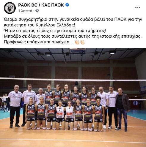 Η κατάκτηση του πρώτου Κυπέλλου στην ιστορία της γυναικείας ομάδας βόλεϊ του ΠΑΟΚ, «ανάγκασε» την ΚΑΕ να της δώσει κι αυτή συγχαρητήρια για το σπουδαίο επίτευγμά της.