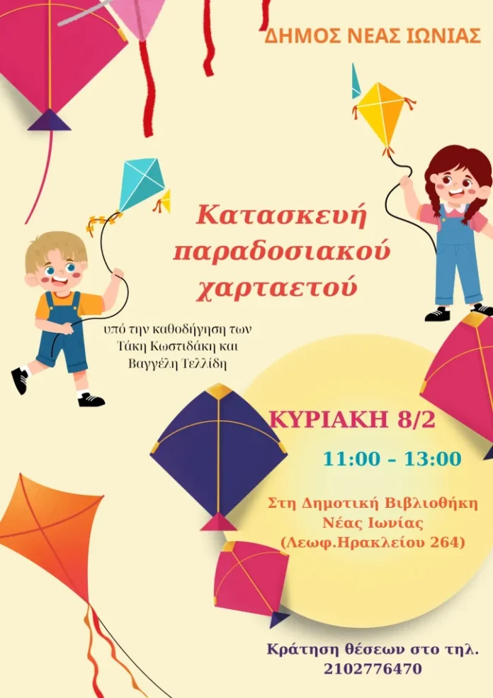Την Κυριακή 8 Φεβρουαρίου, από 11:00 έως 13:00, θα πραγματοποιηθεί Κατασκευή Παραδοσιακού Χαρταετού στη Δημοτική Βιβλιοθήκη Νέας Ιωνίας (Λεωφ. Ηρακλείου 264).