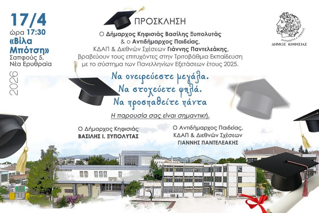Με ιδιαίτερη χαρά και αίσθημα περηφάνιας, ο Δήμαρχος Κηφισιάς, κ. Βασίλης Ξυπολυτάς, και ο Αντιδήμαρχος Παιδείας, Διεθνών Σχέσεων και Κέντρων Δημιουργικής Απασχόλησης Παιδιών, κ. Γιάννης Παντελεάκης, απευθύνουν επίσημη πρόσκληση σε μια ξεχωριστή τελετή βράβευσης. Η εκδήλωση αυτή είναι αφιερωμένη στην επιβράβευση και την τιμή προς τους μαθητές και τις μαθήτριες της Κηφισιάς, οι οποίοι διέπρεψαν στις Πανελλήνιες εξετάσεις και εξασφάλισαν την εισαγωγή τους στην Τριτοβάθμια Εκπαίδευση. Είναι μια ουσιαστική αναγνώριση των κόπων, της προσήλωσης και της αφοσίωσης που επέδειξαν κατά τη διάρκεια της σχολικής τους πορείας, ανοίγοντας πλέον τις πύλες για ένα νέο, απαιτητικό αλλά και γεμάτο προοπτικές ακαδημαϊκό ταξίδι. Η πρωτοβουλία αυτή αναδεικνύει τη δέσμευση του Δήμου απέναντι στη νέα γενιά και στην εκπαιδευτική της ανέλιξη, γιορτάζοντας μαζί τους ένα σημαντικό ορόσημο.