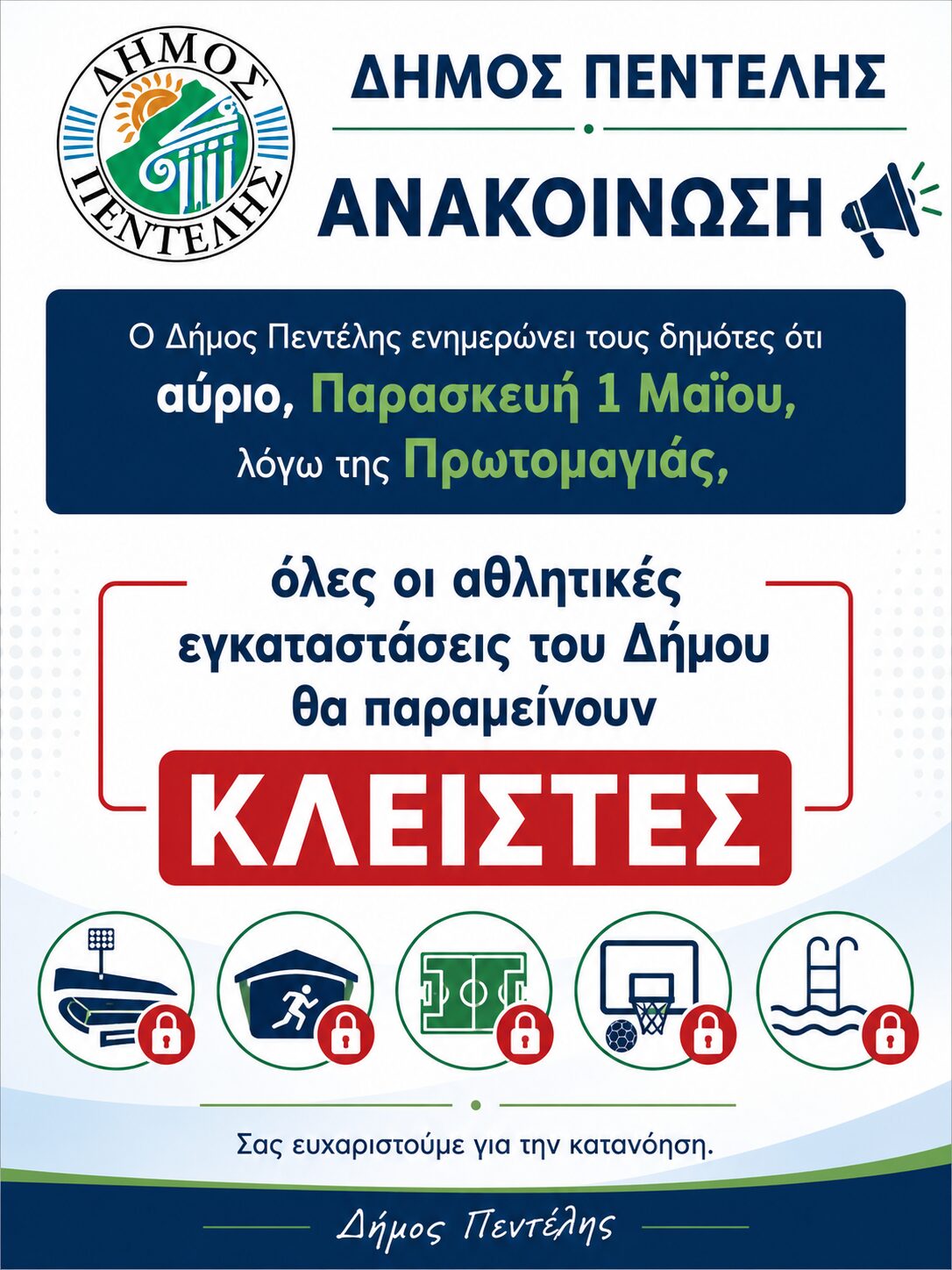 Αρχική ΠΕΝΤΕΛΗ - ΜΕΛΙΣΣΙΑ Κλειστές οι αθλητικές εγκαταστάσεις του Δήμου Πεντέλης την ΠρωτομαγιάΠΕΝΤΕΛΗ - ΜΕΛΙΣΣΙΑΚλειστές οι αθλητικές εγκαταστάσεις του Δήμου Πεντέλης την Πρωτομαγιά 30 Απριλίου, 2026Facebook Twitter Linkedin The post Κλειστές οι αθλητικές εγκαταστάσεις του Δήμου Πεντέλης την Πρωτομαγιά appeared first on Penteli Official Website. ΣΧΕΤΙΚΑ ΑΡΘΡΑ-Νατάσσα Κοσμοπούλου, Δήμαρχος Πεντέλης: Ένα βήμα πιο κοντά να γίνει δικό μας το Δάσος ΠαπαδημητρίουΗ Περιφέρεια Αττικής χρηματοδοτεί με 998.000 ευρώ την αναβάθμιση του Πάρκου Τσαγκάρη στα ΜελίσσιαΚλειστό το Πολιτιστικό Κέντρο στη Δ.Κ Μελισσίων την ΠρωτομαγιάΤελευταία άρθραΕΚΤ: Αμετάβλητα τα βασικά επιτόκια – Σταθερή η νομισματική πολιτική 30 Απριλίου, 2026Κλειστές οι αθλητικές εγκαταστάσεις του Δήμου Πεντέλης την Πρωτομαγιά 30 Απριλίου, 2026Νατάσσα Κοσμοπούλου, Δήμαρχος Πεντέλης: Ένα βήμα πιο κοντά να γίνει δικό... 30 Απριλίου, 2026Η Περιφέρεια Αττικής χρηματοδοτεί με 998.000 ευρώ την αναβάθμιση του Πάρκου... 30 Απριλίου, 2026Χαρδούβελης: €10 δισ. άντληση – Ελληνική οικονομία ασπίδα σε κρίση 30 Απριλίου, 2026