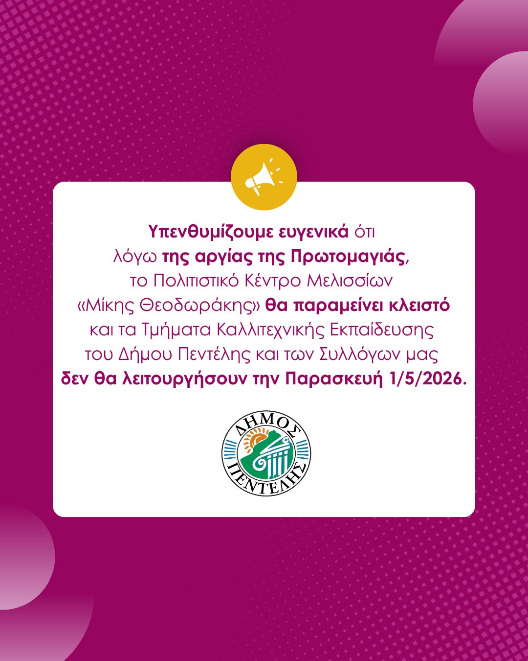 Αρχική ΠΕΝΤΕΛΗ - ΜΕΛΙΣΣΙΑ Κλειστό το Πολιτιστικό Κέντρο στη Δ.Κ Μελισσίων την ΠρωτομαγιάΠΕΝΤΕΛΗ - ΜΕΛΙΣΣΙΑΚλειστό το Πολιτιστικό Κέντρο στη Δ.Κ Μελισσίων την Πρωτομαγιά 29 Απριλίου, 2026Facebook Twitter Linkedin The post Κλειστό το Πολιτιστικό Κέντρο στη Δ.Κ Μελισσίων την Πρωτομαγιά appeared first on Penteli Official Website. ΣΧΕΤΙΚΑ ΑΡΘΡΑ-11η Μαγιάτικη Συνάντηση Κλασικών Οχημάτων στην Πλατεία Αγίας Τριάδας Πεντέλης – 10/5«Το Τρίποντο Ζωής»: Μια ξεχωριστή εκδήλωση συμπερίληψης στον Δήμο ΠεντέληςΗ δήμαρχος Πεντέλης στην 72η Ανθοκομική Έκθεση ΚηφισιάςΤελευταία άρθραΦορολοταρία: Έγινε η κλήρωση – Δείτε αν κερδίσατε έως 50.000 ευρώ 29 Απριλίου, 2026Κηφισιά: Εθελοντική Αιμοδοσία στο ΚΑΠΗ Νέας Ερυθραίας, 7 Μαΐου 29 Απριλίου, 2026Κλειστό το Πολιτιστικό Κέντρο στη Δ.Κ Μελισσίων την Πρωτομαγιά 29 Απριλίου, 202611η Μαγιάτικη Συνάντηση Κλασικών Οχημάτων στην Πλατεία Αγίας Τριάδας Πεντέλης –... 29 Απριλίου, 2026Γιοβιτς στην ΑΕΚ: Ο θρύλος Ιμπραχίμοβιτς έβαλε "πάγο" στην καριέρα του; 29 Απριλίου, 2026