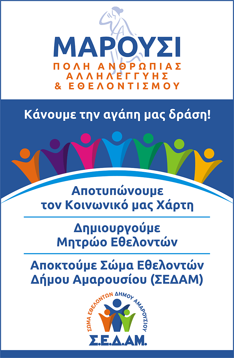 • Ο Δήμος Αμαρουσίου ανακηρύσσεται σε “Πόλη Εθελοντισμού” με τίτλο: “ΜΑΡΟΥΣΙ: ΠΟΛΗ ANΘΡΩΠΙΑΣ, ΑΛΛΗΛΕΓΓΥΗΣ & ΕΘΕΛΟΝΤΙΣΜΟΥ”