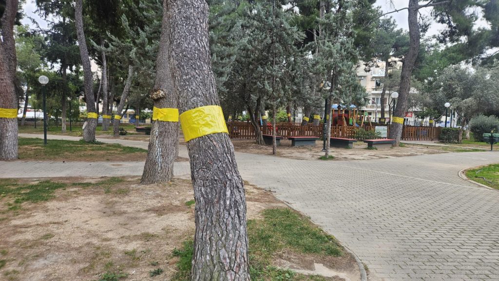 Οι κίτρινες ταινίες στα δένδρα τοποθετούνται για την προστασία των κοινόχρηστων χώρων από τις κάμπιες