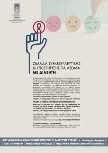 Ο Οργανισμός Κοινωνικής Προστασίας & Αλληλεγγύης του Δήμου Βριλησσίων, ανταποκρινόμενος στα αιτήματα συμπολιτών, προγραμματίζει «Ομάδα συμβουλευτικής και υποστήριξης για τα άτομα με διαβήτη» με τη συμμετοχή 8-10 ατόμων, ανά συνεδρία.