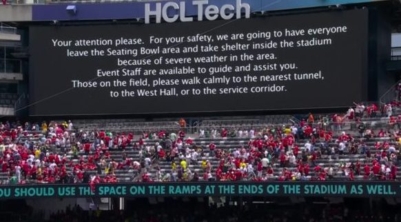 «Την προσοχή σας παρακαλούμε. Για την ασφάλειά σας, θα πρέπει να αποχωρήσετε όλοι από τις θέσεις σας και να αναζητήσετε καταφύγιο εντός του σταδίου εξαιτίας έντονων καιρικών φαινομένων στην περιοχή», έγραψαν οι οθόνες του γηπέδου.