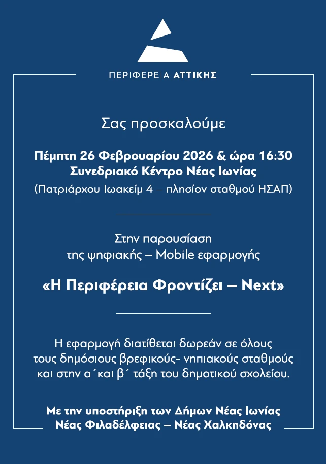 Σας προσκαλούμε την Πέμπτη 26 Φεβρουαρίου 2026 & ώρα 16:30 στο Συνεδριακό Κέντρο Νέας Ιωνίας.