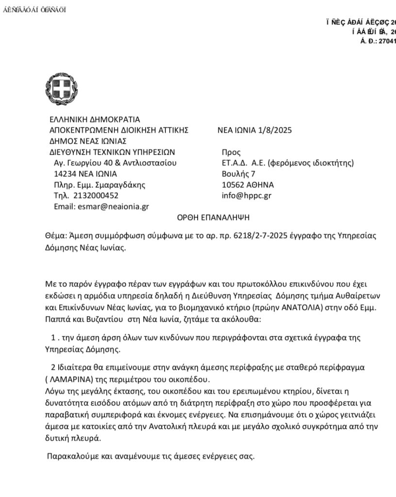 Στην Αποκεντρωμένη Διοίκηση Αττικής με κοινοποίηση στην Εταιρεία Ακινήτων Δημοσίου (ΕΤΑΔ) απευθύνεται με έγγραφό του ο Δήμαρχος Νέας Ιωνία Παναγιώτης Μανούρης για τους κινδύνους που εγκυμονεί κατάσταση στην οποία βρίσκεται το «Ανατόλια».