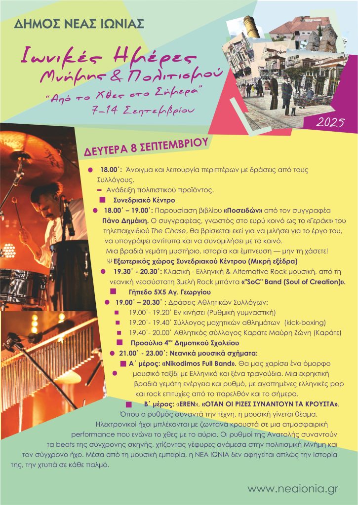 - Β΄ μέρος: «EREN», «ΟΤΑΝ ΟΙ ΡΙΖΕΣ ΣΥΝΑΝΤΟΥΝ ΤΑ ΚΡΟΥΣΤΑ». Όπου ο ρυθμός συναντά την τέχνη, η μουσική γίνεται θέαμα. Ηλεκτρονικοί ήχοι μπλέκονται με ζωντανά κρουστά σε μια ατμοσφαιρική performance που ενώνει το χθες με το αύριο. Οι ρυθμοί της Ανατολής συναντούν τα beats της σύγχρονης σκηνής, χτίζοντας γέφυρες ανάμεσα στην πολιτισμική Μνήμη και τον σύγχρονο ήχο. Μέσα από τη μουσική εμπειρία, η ΝΕΑ ΙΩΝΙΑ δεν αφηγείται απλώς την Ιστορία της, την χτυπά σε κάθε παλμό.