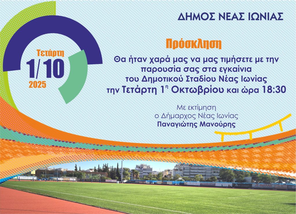 Ο Δήμος Νέας Ιωνίας σας προσκαλεί στα εγκαίνια του ανακαινισμένου Δημοτικού Σταδίου της πόλης μας την Τετάρτη 1 Οκτωβρίου στις 6.30μμ!
