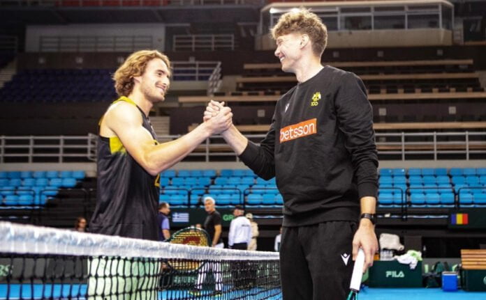 Η Εθνική Ελλάδας στο τένις θα αντιμετωπίσει την αντίστοιχη της Ρουμανίας το ερχόμενο σαββατοκύριακο (3-4/2) στο κλειστό των Άνω Λιοσίων και ο Στέφανος Τσιτσιπάς ήταν εκεί όχι μόνο για προπόνηση αλλά και για να… λύσει τις διαφορές του με τον Μιντάουγκας Κουζμίνσκας της ΑΕΚ, ομάδα της οποίας είναι οπαδός ο κορυφαίος Έλληνας τενίστας.