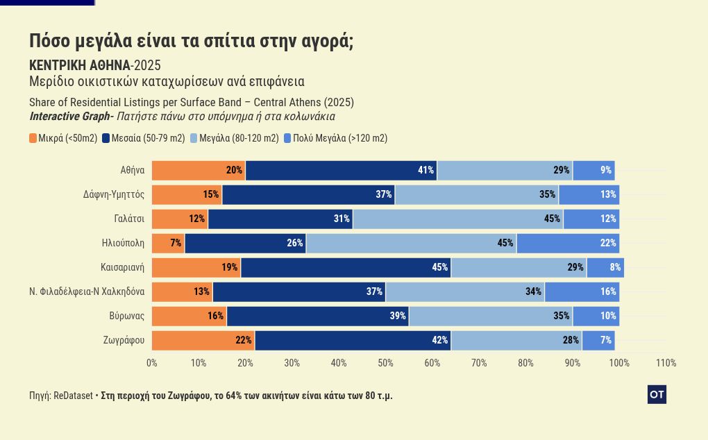 Έρευνα της ReDAtaset, αποκαλύπτει ότι στο Κέντρο της Αθήνας, ο κανόνας είναι τα μικρά και μεσαία διαμερίσματα. Η πυκνή δόμηση και ο χαρακτήρας των δήμων ευνοούν τις μονάδες κάτω των 80 τ.μ., οι οποίες αποτελούν τη συντριπτική πλειοψηφία. Ενδεικτικό είναι το παράδειγμα του Ζωγράφου, όπου το 64% των διαθέσιμων ακινήτων είναι κάτω από το όριο των 80 τ.μ.