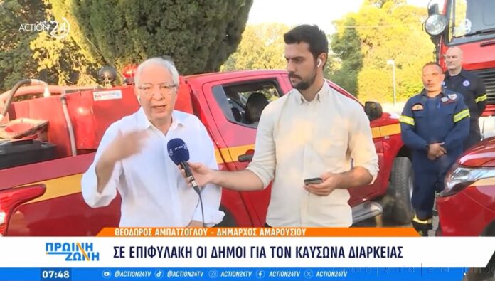 Από το δάσος Συγγρού, έδωσε συνέντευξη ο Δήμαρχος Αμαρουσίου Θεόδωρος Αμπατζόγλου στο Action24 – εκπομπή “Πρωϊνή ζώνη” με τον Γιώργο Κακούση και την Άννα Λιβαθυνού , για τα θέματα πυροπροστασίας και τη σχετική προετοιμασία του Δήμου ενόψει καύσωνα.