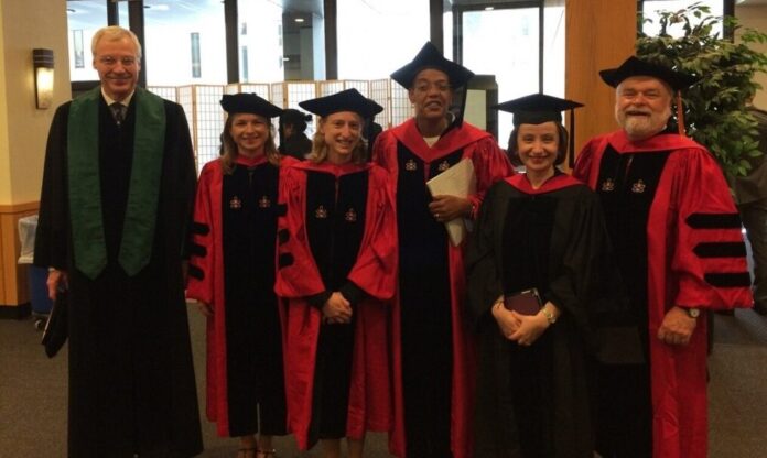 Ορκωμοσία φοιτητών στο Πανεπιστήμιο Harvard: πρώτος από αριστερά ο Καθηγητής A. Hofman και δεύτερη από δεξιά η Καθηγήτρια Π. Λάγιου με Καθηγητές του Τμήματος Επιδημιολογίας.