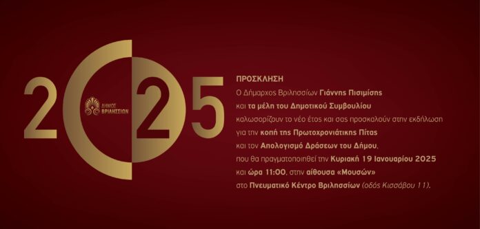 Ο Δήμαρχος Βριλησσίων Γιάννης Πισιμίσης και τα μέλη του Δημοτικού Συμβουλίου καλωσορίζουν το νέο έτος και σας προσκαλούν στην εκδήλωση για την κοπή της Πρωτοχρονιάτικης Πίτας και τον Απολογισμό Δράσεων του Δήμου, που θα πραγματοποιηθεί την Κυριακή 19 Ιανουαρίου 2025 και ώρα 11:00, στην αίθουσα «Μουσών» στο Πνευματικό Κέντρο Βριλησσίων (οδός Κισσάβου 11).