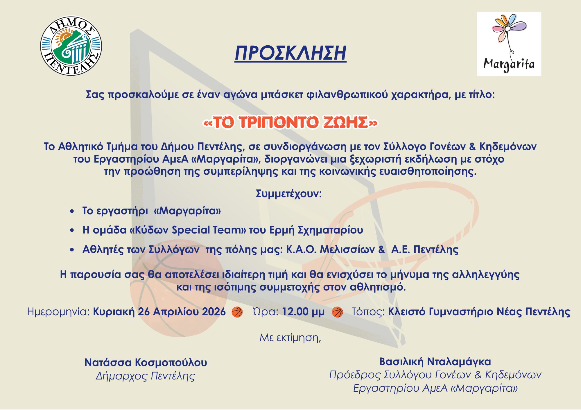 Αρχική ΠΕΝΤΕΛΗ - ΜΕΛΙΣΣΙΑ ‘Το Τρίποντο Ζωής’ αγώνας φιλανθρωπικού χαρακτήρα -26/4ΠΕΝΤΕΛΗ - ΜΕΛΙΣΣΙΑ‘Το Τρίποντο Ζωής’ αγώνας φιλανθρωπικού χαρακτήρα -26/4 24 Απριλίου, 2026Facebook Twitter Linkedin The post ‘Το Τρίποντο Ζωής’ αγώνας φιλανθρωπικού χαρακτήρα -26/4 appeared first on Penteli Official Website. ΣΧΕΤΙΚΑ ΑΡΘΡΑ-ΠΙΝΑΚΑΣ ΘΕΜΑΤΩΝ ΠΟΥ ΣΥΖΗΤΗΘΗΚΑΝ ΣΤΗΝ 15η ΤΑΚΤΙΚΗ ΣΥΝΕΔΡΙΑΣΗ ΔΙΑ ΖΩΣΗΣ ΤΗΣ ΔΗΜΟΤΙΚΗΣ ΕΠΙΤΡΟΠΗΣΠρόσκληση Σύγκλησης της 16ης τακτικής συνεδρίασης της Δημοτικής ΕπιτροπήςΕνημέρωση κοινού για τη λήψη μέτρων πρόληψης και αυτοπροστασίας από κινδύνους που προέρχονται από δασικές πυρκαγιέςΤελευταία άρθρα‘Το Τρίποντο Ζωής’ αγώνας φιλανθρωπικού χαρακτήρα -26/4 24 Απριλίου, 2026Αγορές Ευρώπης: Αντιφατικές Τάσεις εν μέσω Εντάσεων στο Στενό του Ορμούζ 24 Απριλίου, 2026Τραμπ: Απειλή δασμών στη Βρετανία για φόρο σε Big Tech 24 Απριλίου, 2026Final 4 Αθήνα: Το σήμα που ενώνει Αρχαίο Κόσμο και Σύγχρονη... 24 Απριλίου, 2026Αντιμετωπίζουμε τη μεγαλύτερη απειλή ενεργειακής ασφάλειας στην ιστορία 24 Απριλίου, 2026